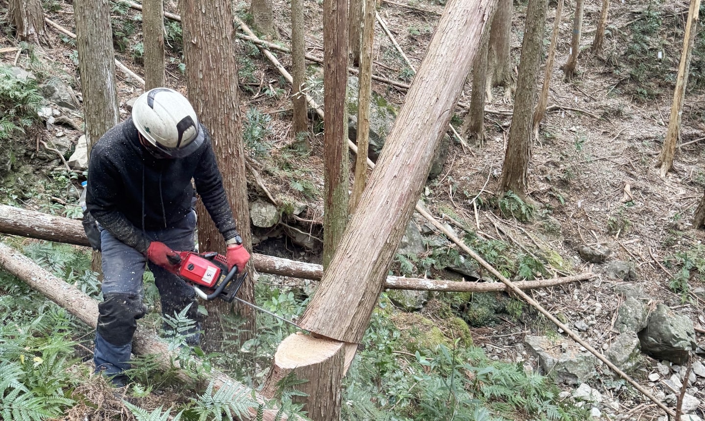 現在6年目で、現場技術者として、除伐・間伐などの森林整備、立木の伐採と搬出、人家裏などの危険木伐採などの業務に従事しています。働き始めた最初の1年は体力的に厳しく、作業中に「危険」も感じましたが、2年目くらいから、山で働く体力や基本的な技術が身に付き、不注意が「危険」を生むことも分かって、仕事に取組みやすくなりました。4年目からは、仕事を楽しく感じることができるようになりました。